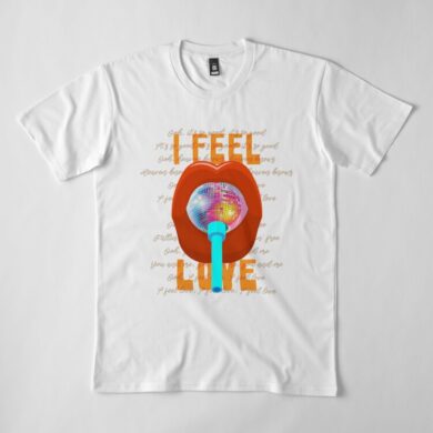 Savor the sweet taste of disco magic with this delightful artwork featuring a disco ball playfully encased in a mouth like a lollipop. Behind this captivating image, the words “I FEEL LOVE” beckon, paying homage to Donna Summer’s iconic disco hit. This piece is a delicious fusion of visual delight and musical nostalgia, inviting you to indulge in the enchanting flavors of disco euphoria.