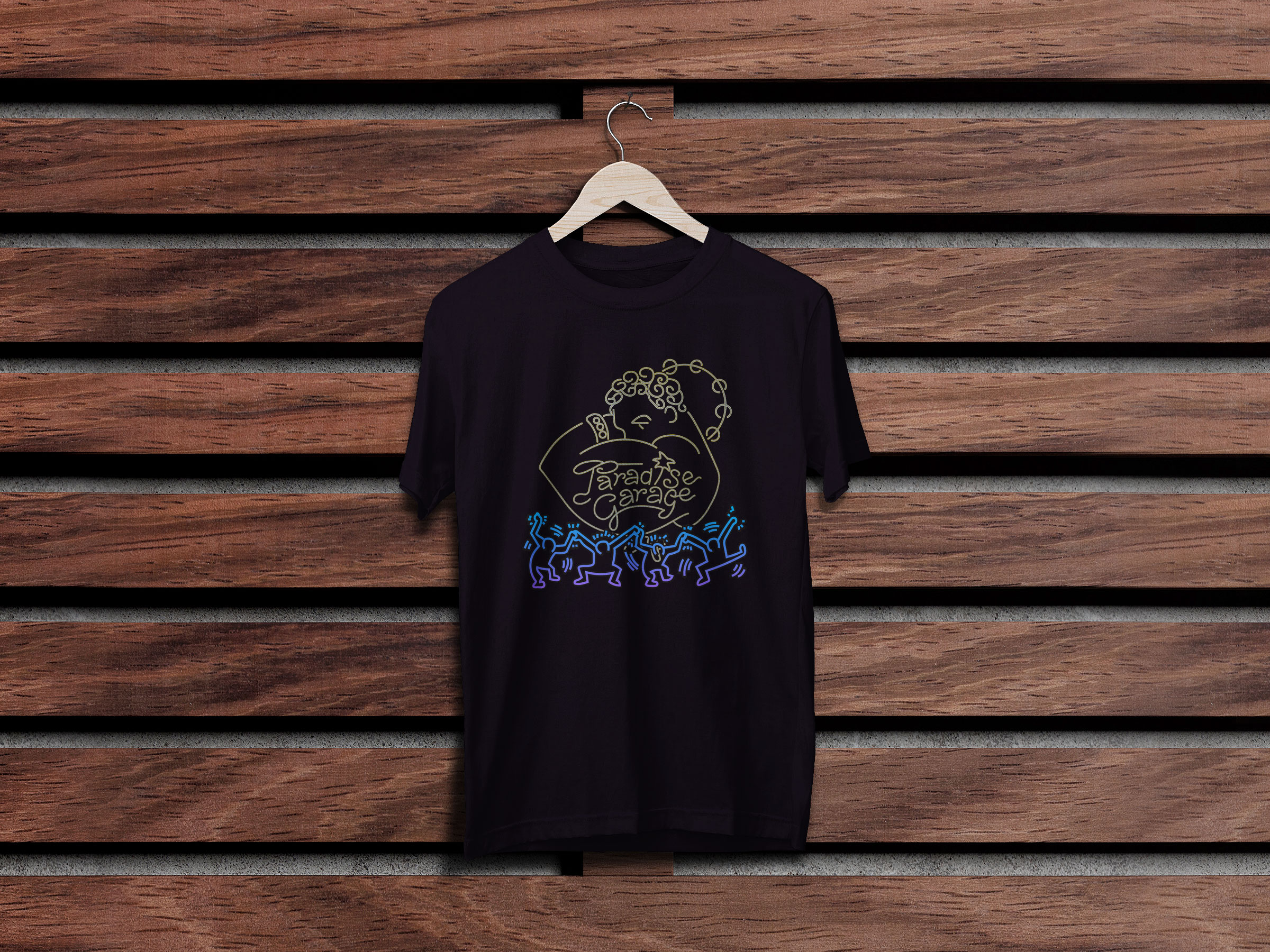 This stunning artwork features a powerful image of a black man with curly hair, wearing a gold bracelet, and holding a tambura, a traditional stringed instrument from his cultural heritage. On his arm, a tattoo reads “Paradise Garage”, a tribute to the legendary New York City nightclub that helped to define the disco era.