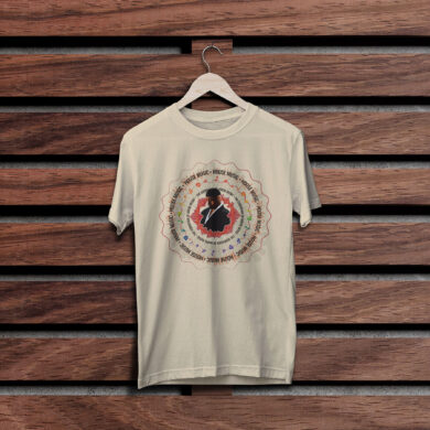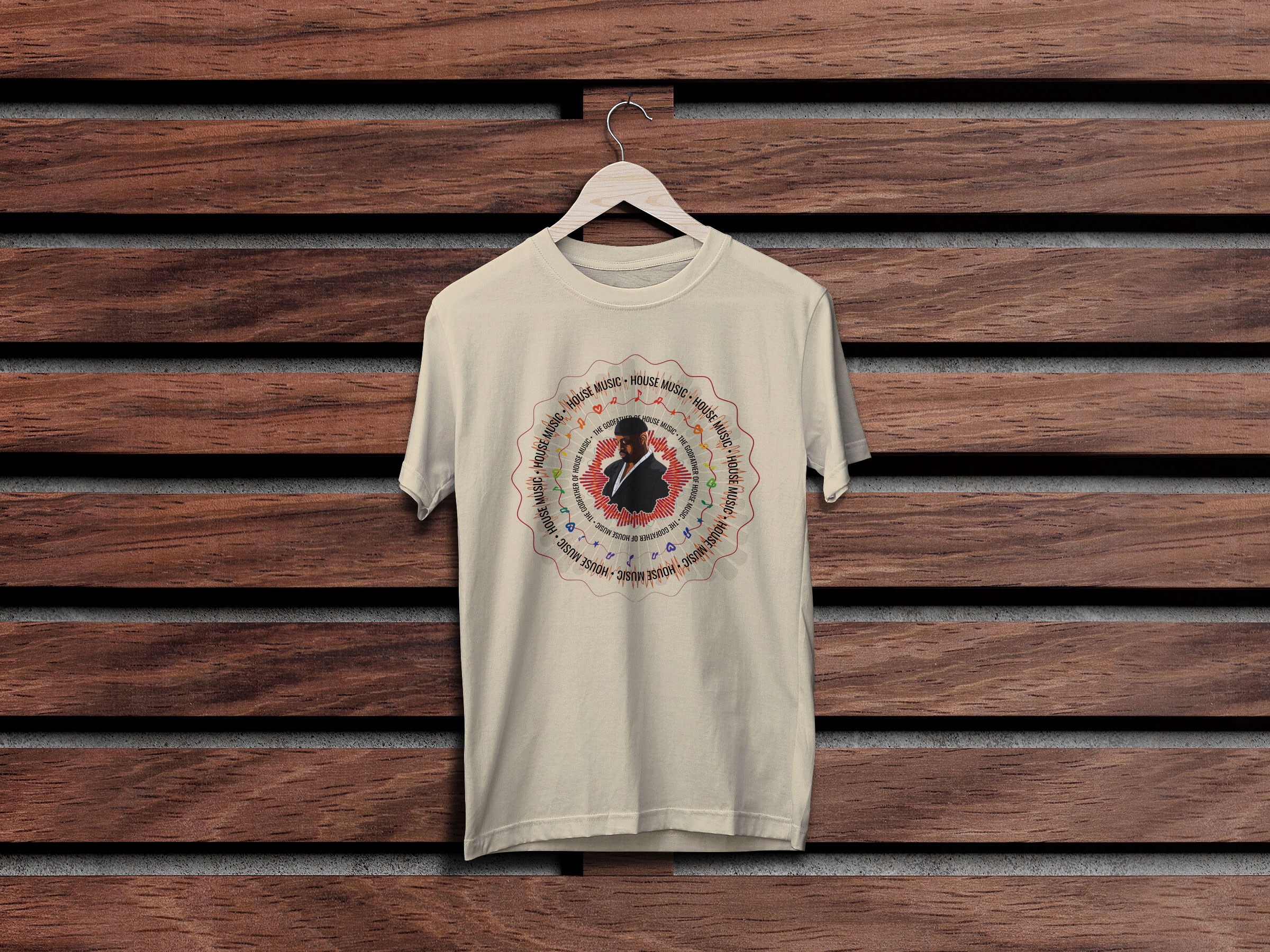 Accompanying the portrait and waveforms are the prominent texts “House Music” and “Godfather of House Music.” These words pay tribute to Frankie Knuckles’ pivotal role in pioneering and popularizing the genre. The text is designed in a bold, eye-catching style that adds to the overall pop-art aesthetic of the artwork.